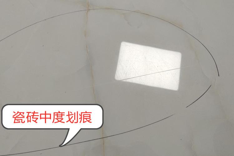 第二、中度劃痕:燈光下陽光下一眼就能看出來,因為劃痕的地方?jīng)]有反光,用指甲滑動明顯有阻礙。修復(fù)流程:先用專業(yè)的磨片把劃痕處銳利的周邊磨平滑,然后涂上免燒釉修復(fù)劑,配合手持拋光機進行柔拋,每一次2分鐘左右,在拋光過程中會產(chǎn)生熱量,熱量與修復(fù)劑反應(yīng)形成釉面,每涂一次,拋一次,就會形成一層釉面,一般三遍左右,就能完全修復(fù),把劃痕凹陷處填平了,由于是高溫形成的釉面,所以劃痕處的釉層能夠與磚面牢固結(jié)合,耐水擦洗,超高亮度,堅硬耐磨,你自己都很難發(fā)現(xiàn)原來的劃痕在哪里。這樣的效果您滿意嗎?